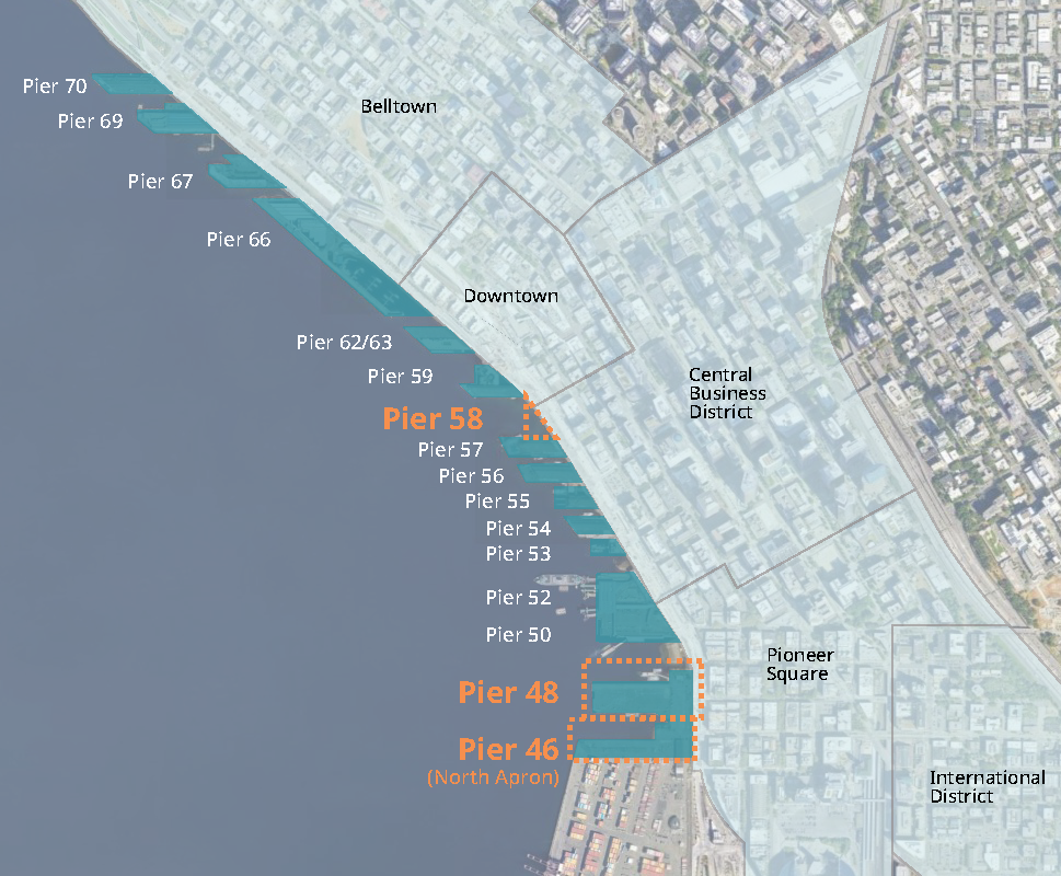 The Seattle Terminal Siting Study evaluated potential locations along the downtown Seattle Waterfront starting north at Pier 70 down to Pier 46 to the south. Of those locations, Pier 46 North Apron, Pier 48, and Pier 58 have been identified as potential terminal sites.
