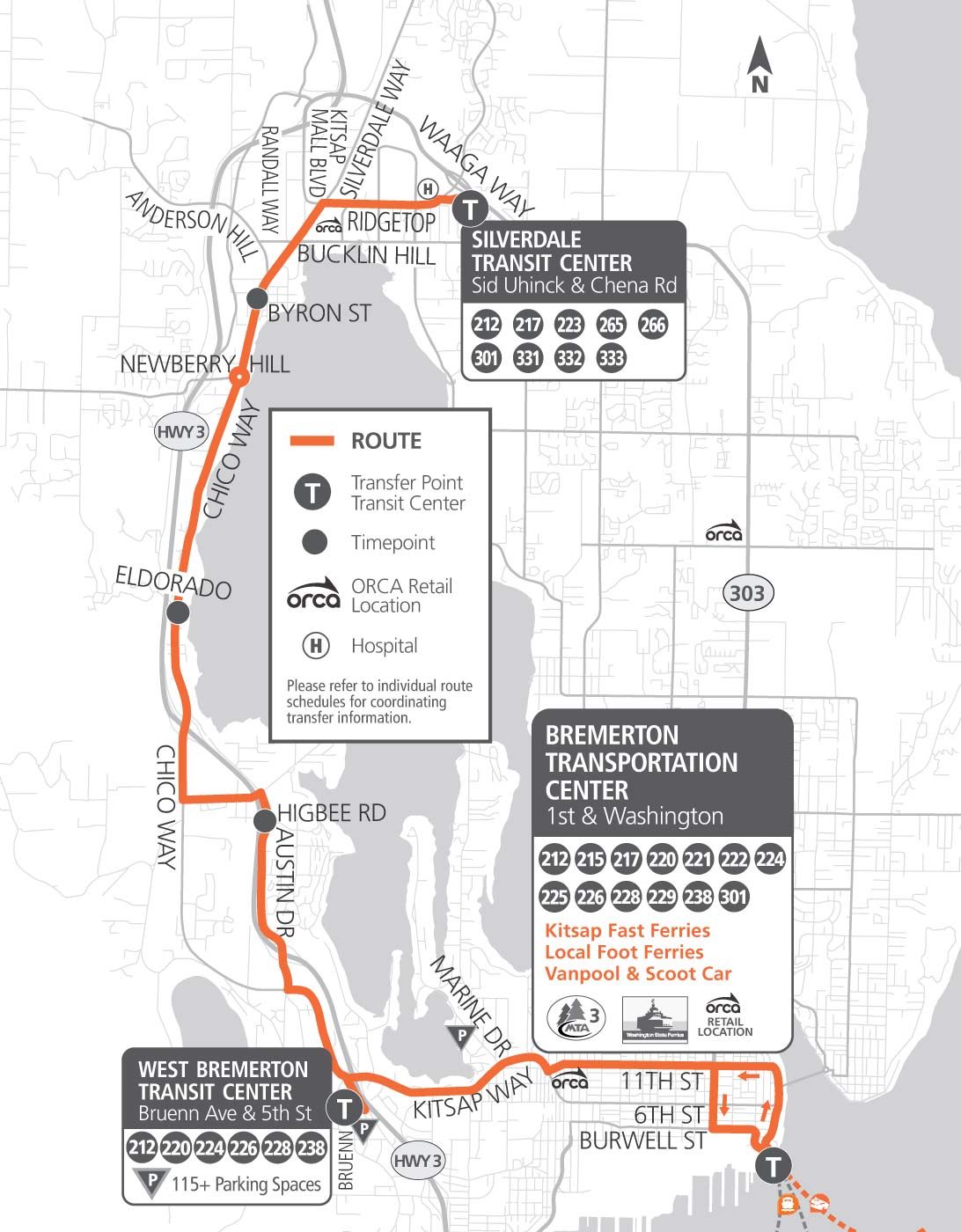 Service TimesWeekdays & Saturday Areas ServedSilverdale Transit Center, Ridgetop Avenue, Silverdale Way, Chico Way, Erlands Point Road, Austin Drive, Kitsap Way, Auto Center Way, Kitsap Way, 11th Street, West Bremerton Safeway, Warren Avenue, Burwell Street, Washington Avenue, and Bremerton Transportation Center. StopsThis bus will stop at all marked stops. Schedule Effective September 14, 2025This route makes connections with Washington State Ferries (WSF). For WSF schedules, visit wsdot.wa.gov. |