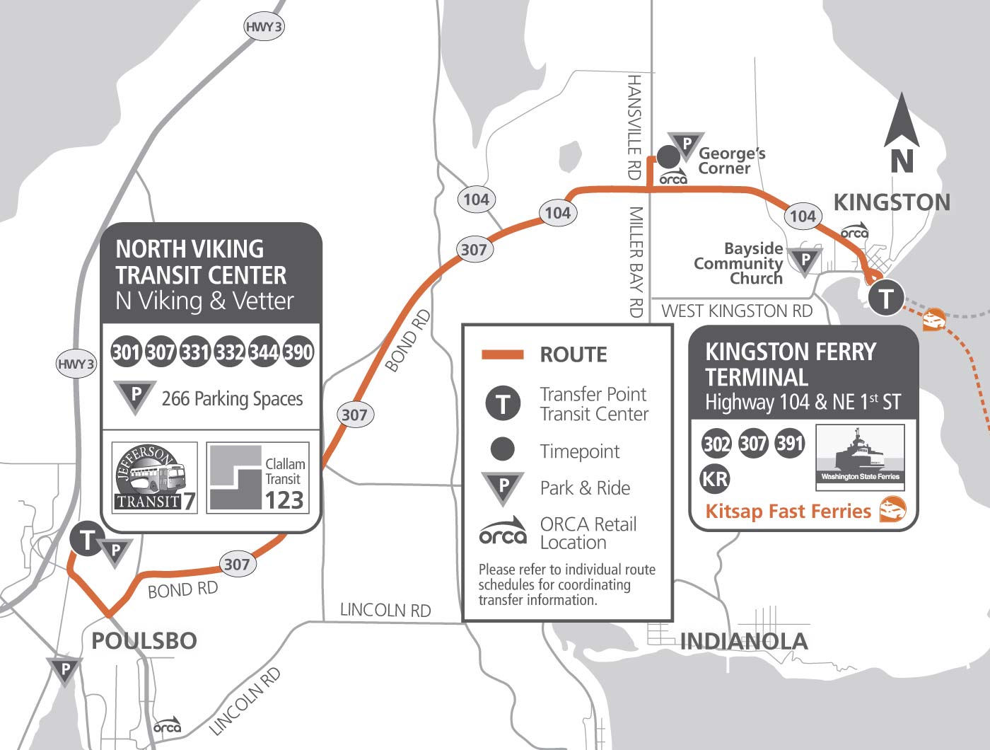 Service TimesMonday - Friday Saturday service operates from May through September each year. Areas ServedKingston Ferry Terminal, North Viking Transit Center and Park & Ride, George's Corner Park & Ride. Click here to view Park & Ride options. StopsThis bus will stop at marked stops. Schedule Effective September 14, 2025This route makes connections with Washington State Ferries (WSF). For WSF schedules, visit wsdot.wa.gov. |