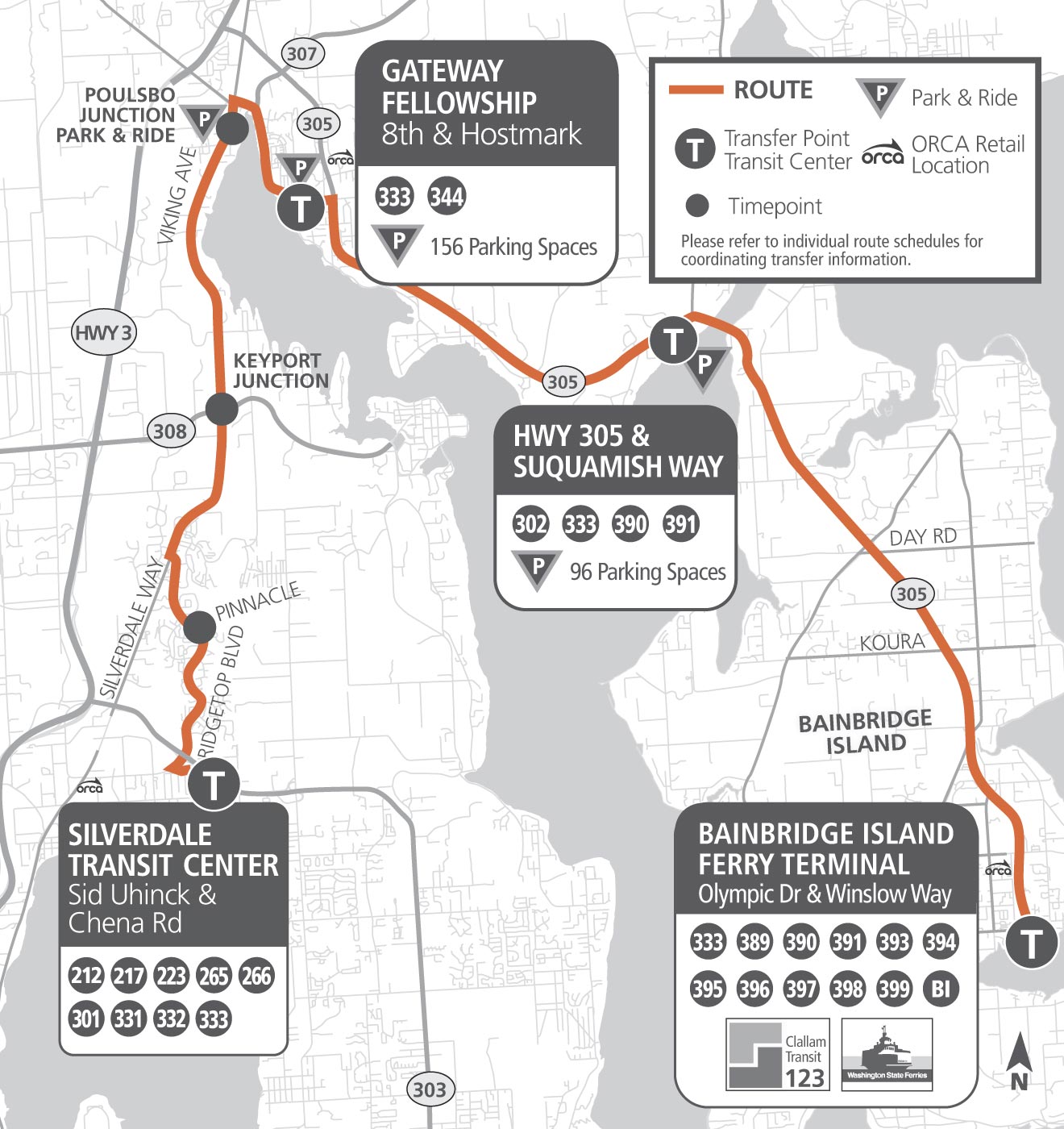 For additional service between Poulsbo and Bainbridge Island, use Route 390.