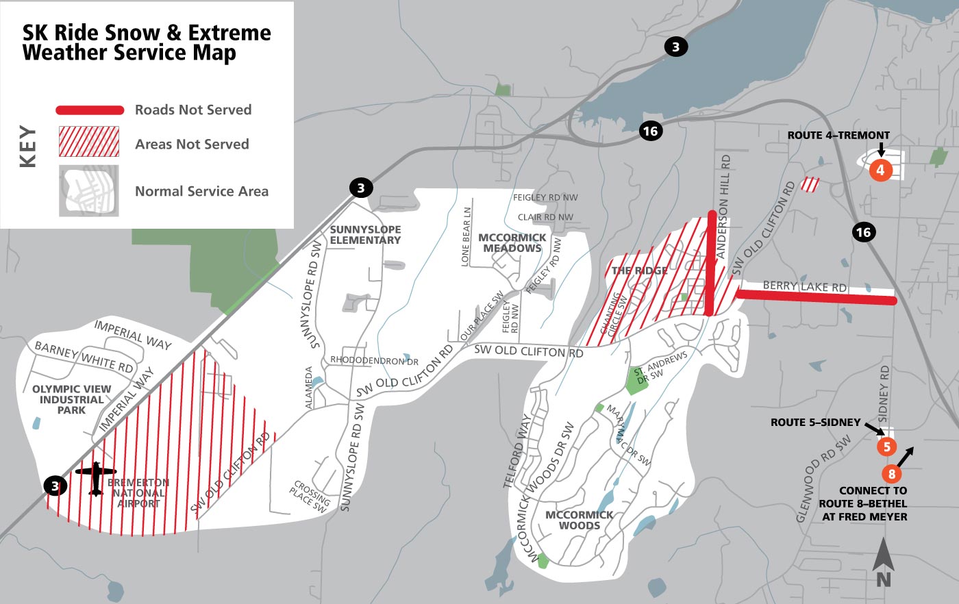 StopsStops are made only within the service area and all rides must start and/or end inside the service area. The bus will also serve Port Orchard Harrison, the Youth Services Center on Old Clifton Road, the Safeway on Sedgwick, Cedar Heights Jr. High, Fred Meyer and the 76 Station on Sedgwick. The bus will also make direct trips from the service area to the Kitsap Transit Port Orchard Foot Ferry before 8:00 AM on weekdays. Snow RouteSK Ride will travel a modified service area when Snow and Extreme Weather events are activated unless service has been canceled or altered to Emergency Service. See Snow & Extreme Weather Service Area Map to the right. Schedule Effective: January 22, 2024 |