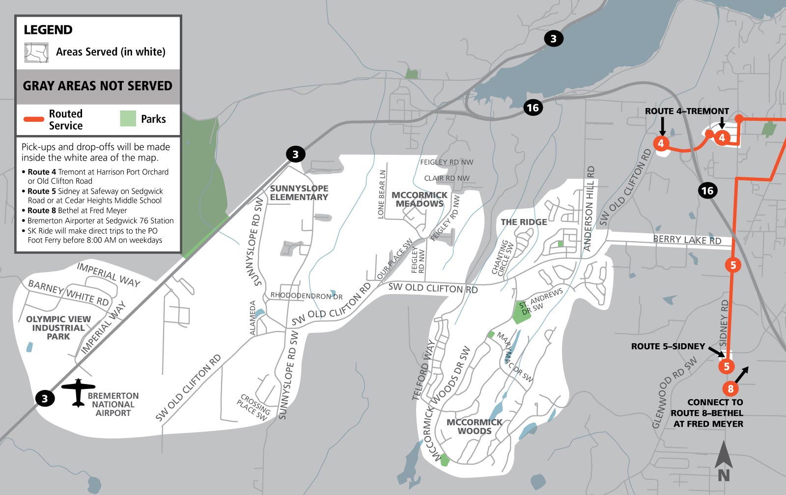Holidays: Click here for SK Ride's Holiday Schedule.Areas ServedMcCormick Woods, Sunnyslope, Bremerton National Airport, Olympic View Industrial Park, The Ridge, McCormick Meadows. Where Can I GoCatch the bus to work, shopping, lunch or to visit friends. The service area includes McCormick Woods, Sunnyslope, Bremerton National Airport and the Olympic View Industrial Center. The bus will pick you up at the intersection nearest to your requested pick-up location. Vehicles will not travel down driveways or dead-end streets. ConnectionsSK Ride can connect you with these transit options during service hours: